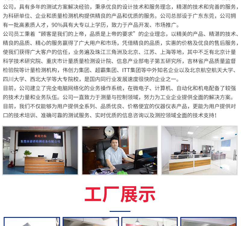 欢迎来到东莞市嘉诺检测设备有(yǒu)限公司网站,我们竭诚為(wèi)您提供服務(wù)!公司主要专业从事各类精密品管检测仪器及环境试验设备研发和销售